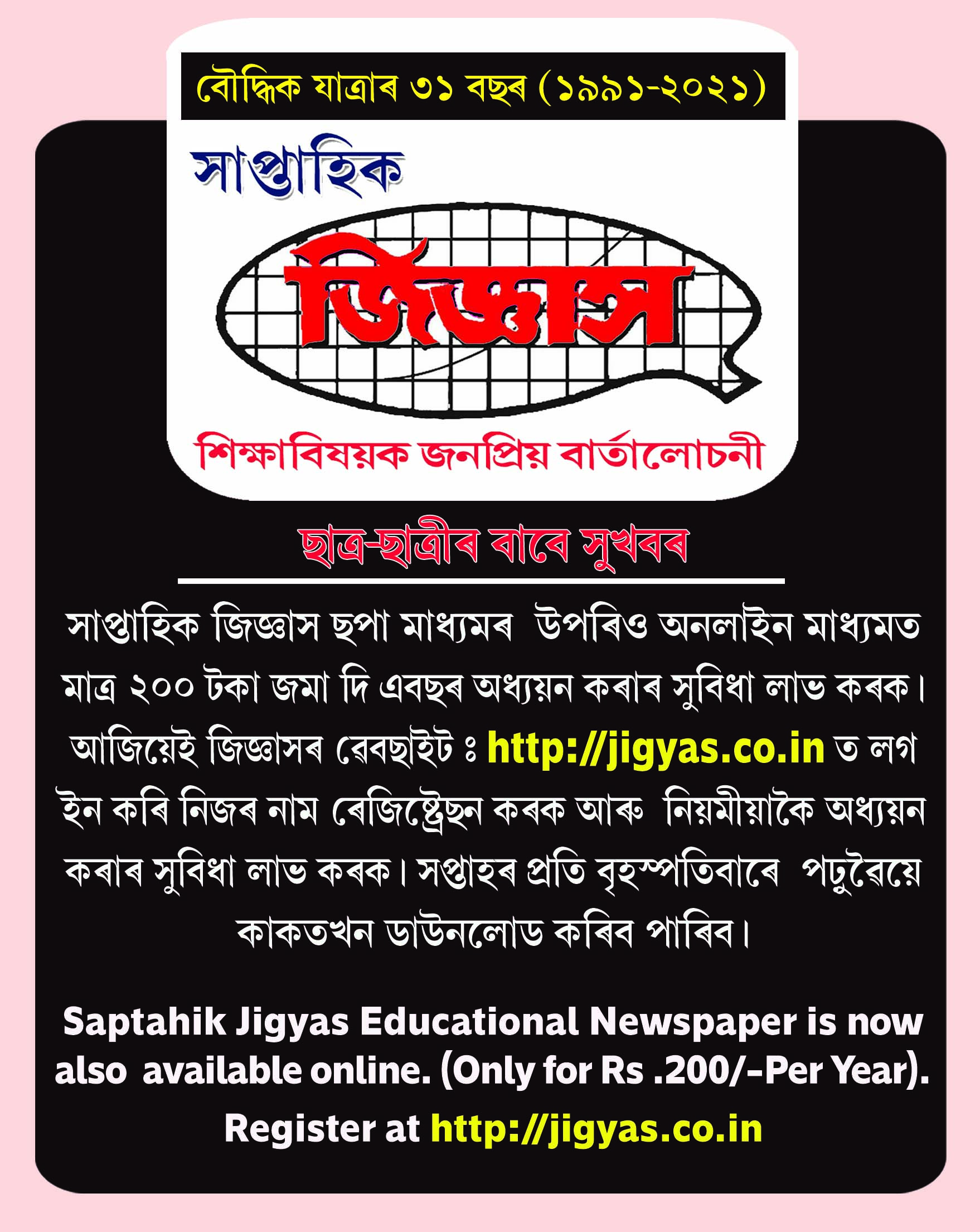১৯৯১ চনৰ ২৮ ফেব্ৰুৱাৰী ৷ ৰাষ্ট্ৰীয় বিজ্ঞান দিৱস ৷ এই শুভ দিনটোতে অসমৰ বিদ্যায়তনিক ক্ষেত্ৰ খনত আত্মপ্ৰকাশ ঘটিছিল ’সাপ্তাহি ক জিজ্ঞাস’ৰ ৷ বৌদ্ধিক যাত্ৰাৰ ৩১ বছৰত সফলতাৰে পদাৰ্পণ কৰা জিজ্ঞাস প্ৰকাশন গোষ্ঠীৰ দ্বাৰা প্ৰকাশিত এই ’সাপ্তা হিক জিজ্ঞাস’ অসমৰ একমাত্ৰ শৈক্ষিক বাৰ্তালোচনী ৷ যি সময়ত অসমৰ শিক্ষা জগতত, বিশেষকৈ গাওঁ অঞ্চলত, গৃহশিক্ষক আৰু আন কোনো নিৰ্ভৰযোগ্য সহায়ক গ্ৰন্থ, আলোচনী বা বাৰ্তালোচনীৰ বিশেষ ব্যৱস্থা নাছিল সেই সময়ত ছাত্ৰছাত্ৰী সকলৰ বৌদ্ধিক বিক াশৰ উত্তৰণত সহায়ৰ হাত আগবঢ়োৱাতোই আছিল আমাৰ এই জিজ্ঞাস বাৰ্তলোচনীৰ একমাত্ৰ উদ্দেশ্য ৷ সেই সময়ত শিক্ষাৰ ক্ষেত্ৰত আজ িৰ দৰে বৈদ্যুতিন মাধ্যমৰ কোনো ব্যৱস্থাই নাছিল আৰু অসমৰ ছাত্ৰছাত্ৰী সকলে লাভ কৰা সুবিধা দেশৰ আন ৰাজ্যৰ ছাত্ৰছাত্ৰী ৰ তুলনাত বৰ পুতৌজনক আছিল ৷ সেয়েহে আমাৰ ছাত্ৰছাত্ৰী সকলেও যাতে বিদ্যায়তনিক দিশত কিছু সমল লাভ কৰিব পাৰে তাৰ বাবে আমি এই বাৰ্তালোচনী খন প্ৰকাশ কৰি অসমৰ চুকেকোণে শিক্ষাৰ প্ৰচাৰৰ দিহা কৰিছিলোঁ ৷ সেইমতে, বিশেষকৈ অসমীয়া মাধ্যমৰ বিদ্যালয়ৰ প্ৰ ায় সকলো ছাত্ৰছাত্ৰী, শিক্ষক-শিক্ষয়িত্ৰী আৰু অভিভাৱক-অভিভাৱিকা সকলে ’জিজ্ঞাসক’ সহৃদয়ে আদৰি লৈ আমাৰ উদ্দেশ্য সফল কৰিছিল ৷